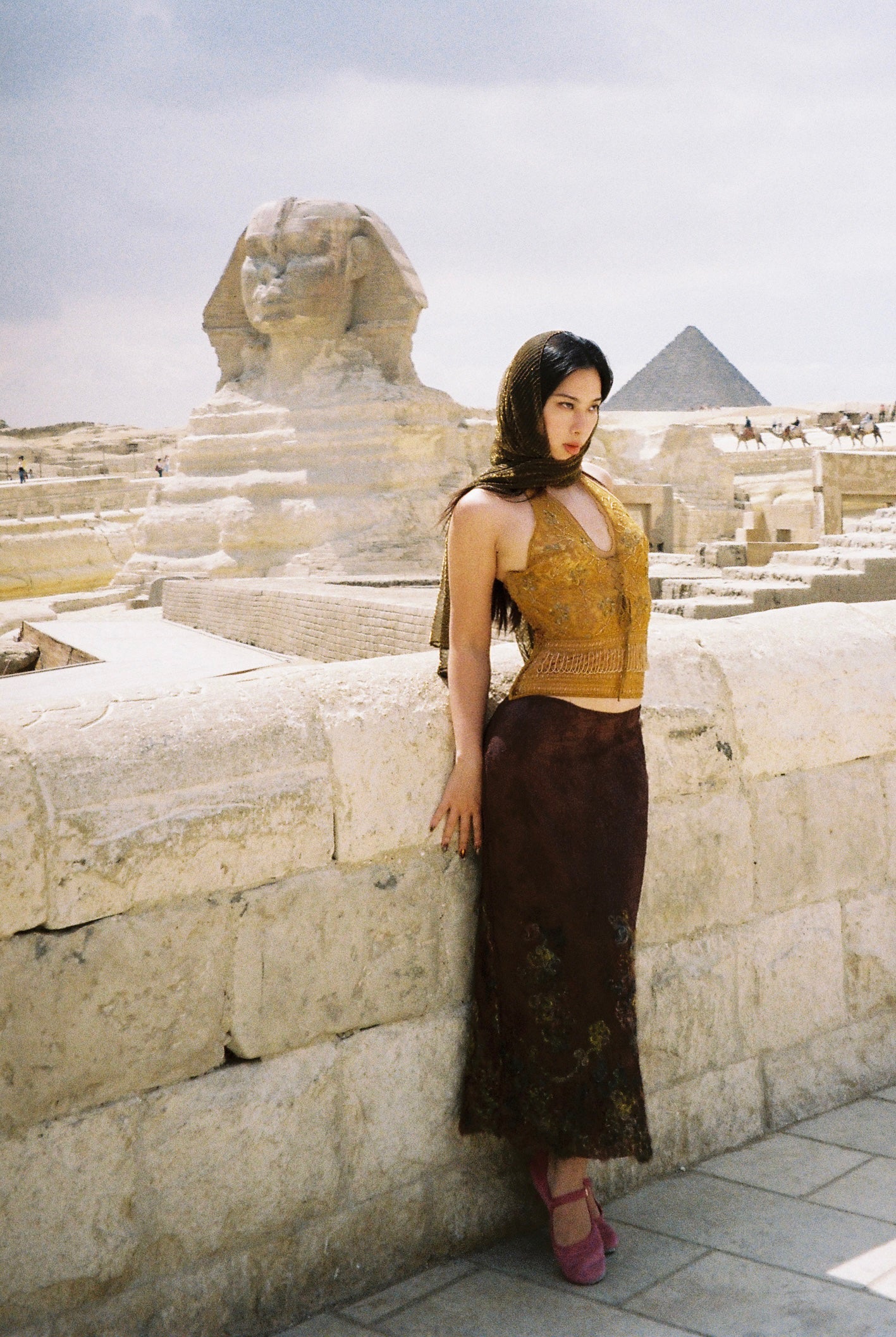 Pale pink petals entwined with the delicate folds of her La Perla skirt, imparting their hue onto the fabric. Brewing a bright pink, akin to that Blumarine form-fitting dress. Another crimson rose petal tumbled from the envelope, landing on the vibrant red silk of her Valentino blouse, drifting down slowly, withering into a deep brown, mirroring the essence of that woven rose skirt from Dolce & Gabbana in 1997. Elegant, romantic, timeless.