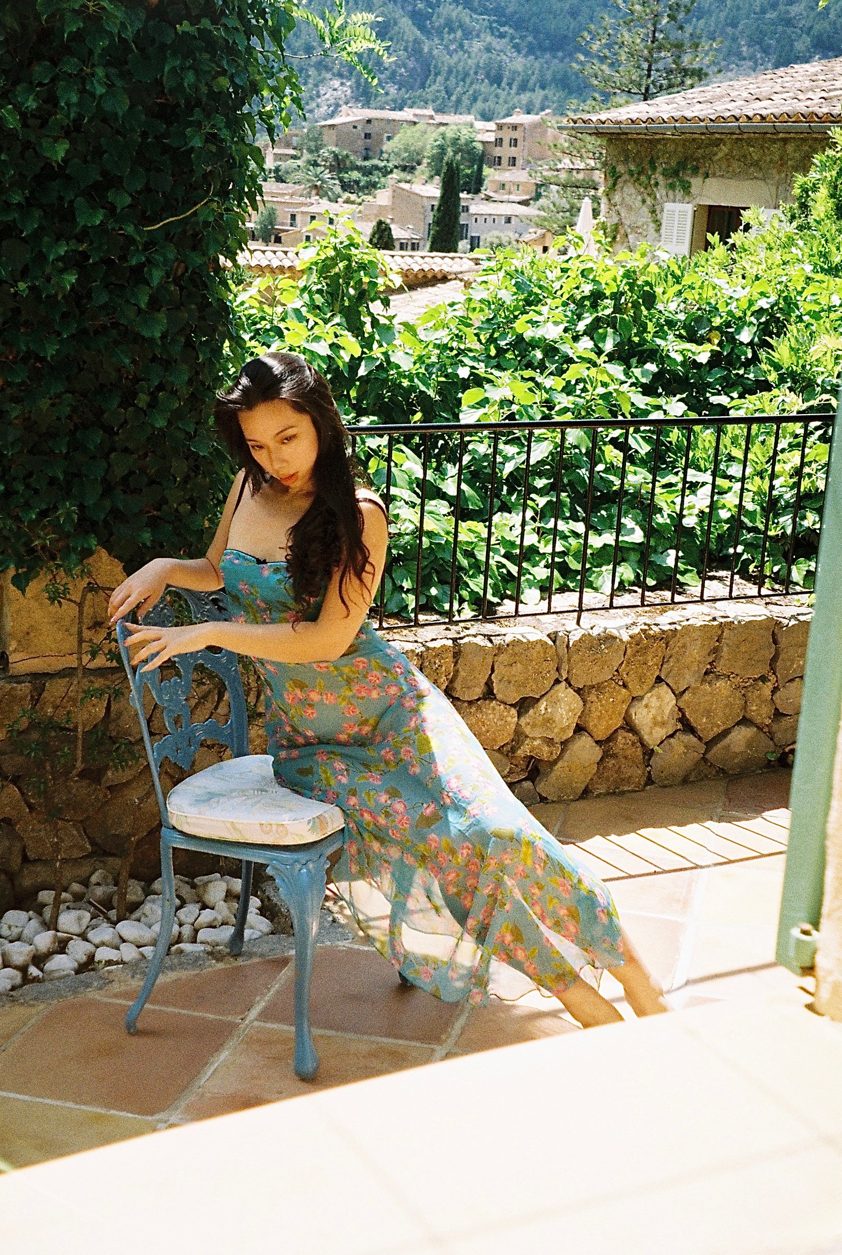 the soft flaxen Ralph Lauren dress of white, scattered flowers;