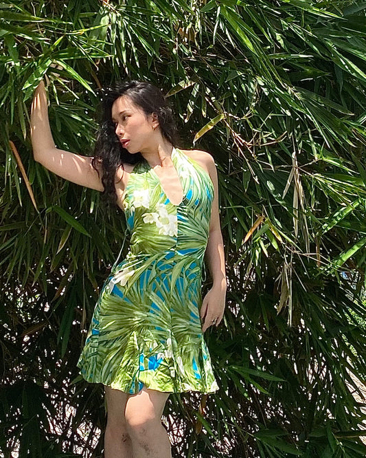 Blugirl Blumarine Palm Tree Print Halter Neck Silk Dress