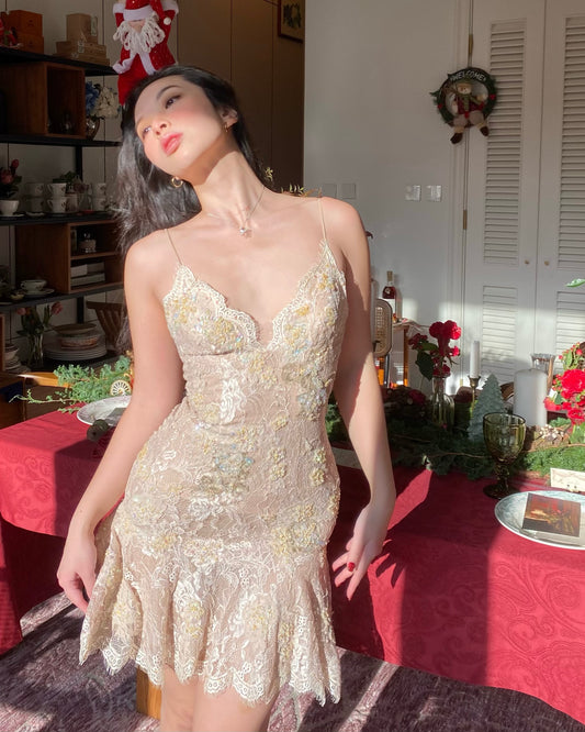 Vintage Beige Floral Lace Mini Dress with Sequins Appliqués