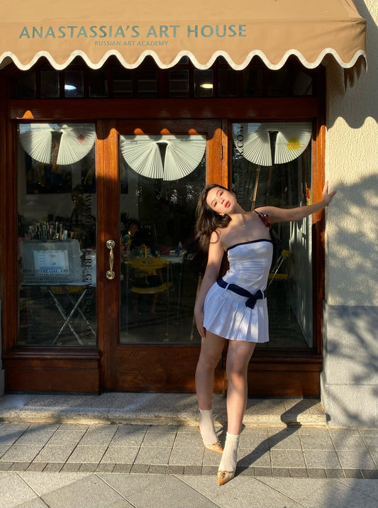 Valentino White Pleated Mini Dress with Blue Ribbon