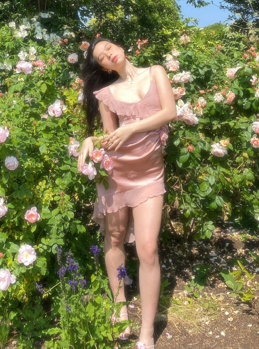 Light Mauve Silk Midi Dress With Rose Appliqué And Ruffles Detail