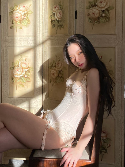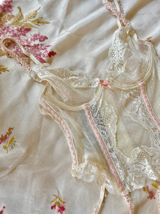 Cream And Pink Lace Floral Bodysuit With Leopard Print Trims and Boning