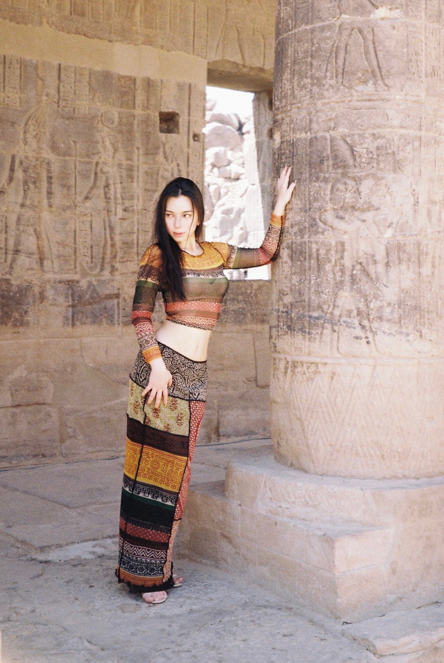 Jean Paul Gaultier 90s Sanskrit Print Mesh Top and Skirt Set