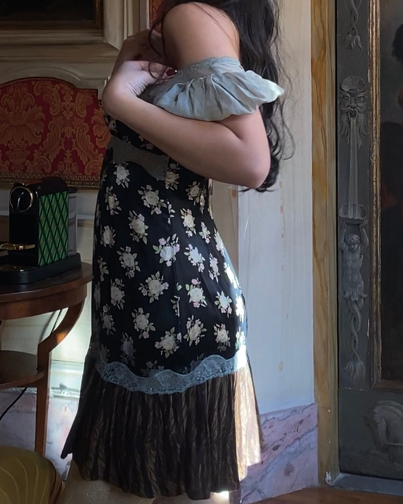 A stunning festive piece from Dolce & Gabbana's Fall/Winter 2006 runway, this dress is a true celebration of texture and design. The puffed sleeves, crafted from green silk chiffon, exude whimsical elegance, while the body features a striking combination of brown lace and floral-printed black silk. The hemline, made of cotton with a bold animal print overlay, adds a playful yet sophisticated touch. Pair it with golden glitter tights, as styled on the runway, for the ultimate holiday-ready look.