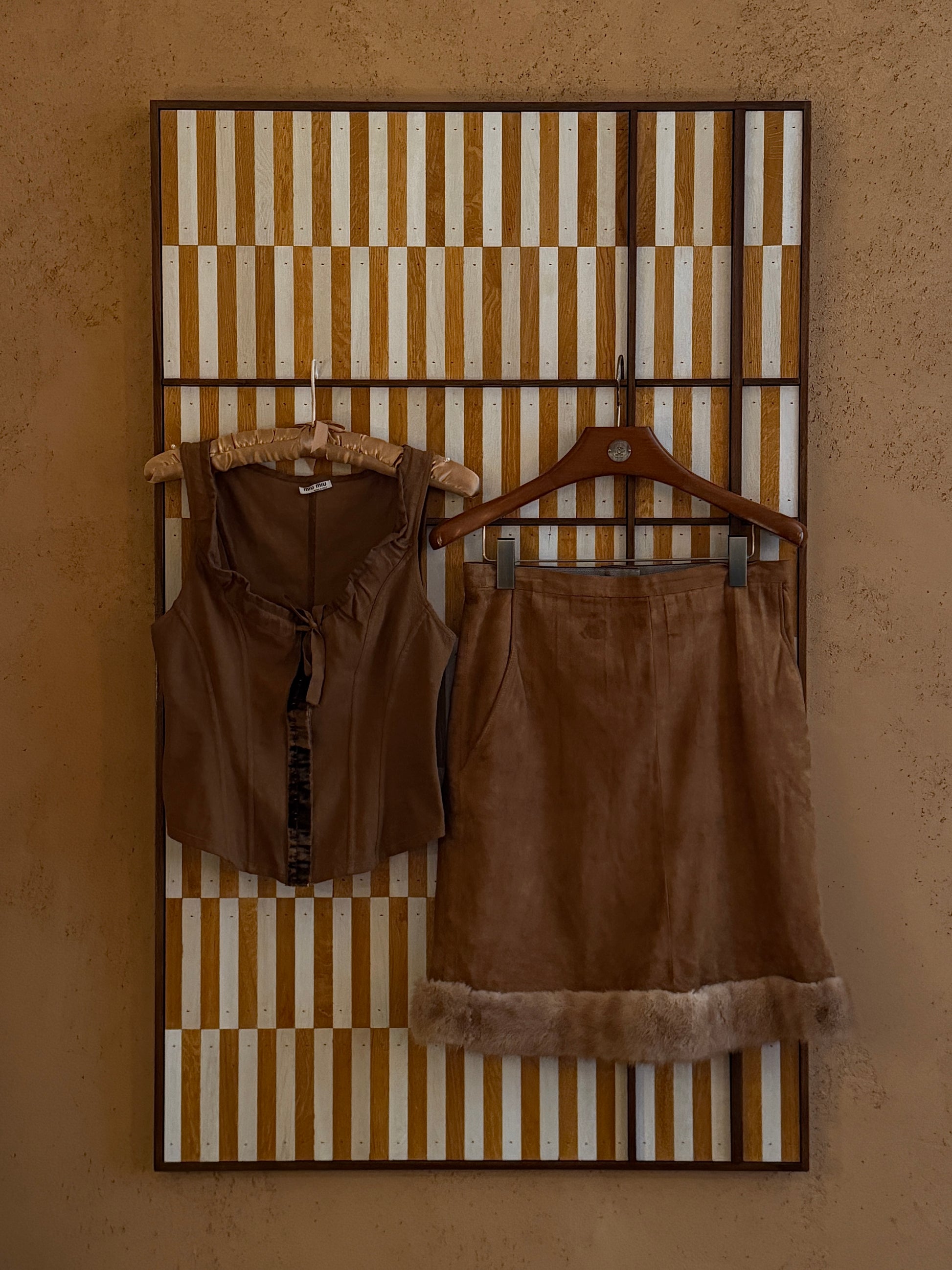 Miu Miu 2000s Light Brown Corset & Vintage Fur Trimmed Suede Skirt