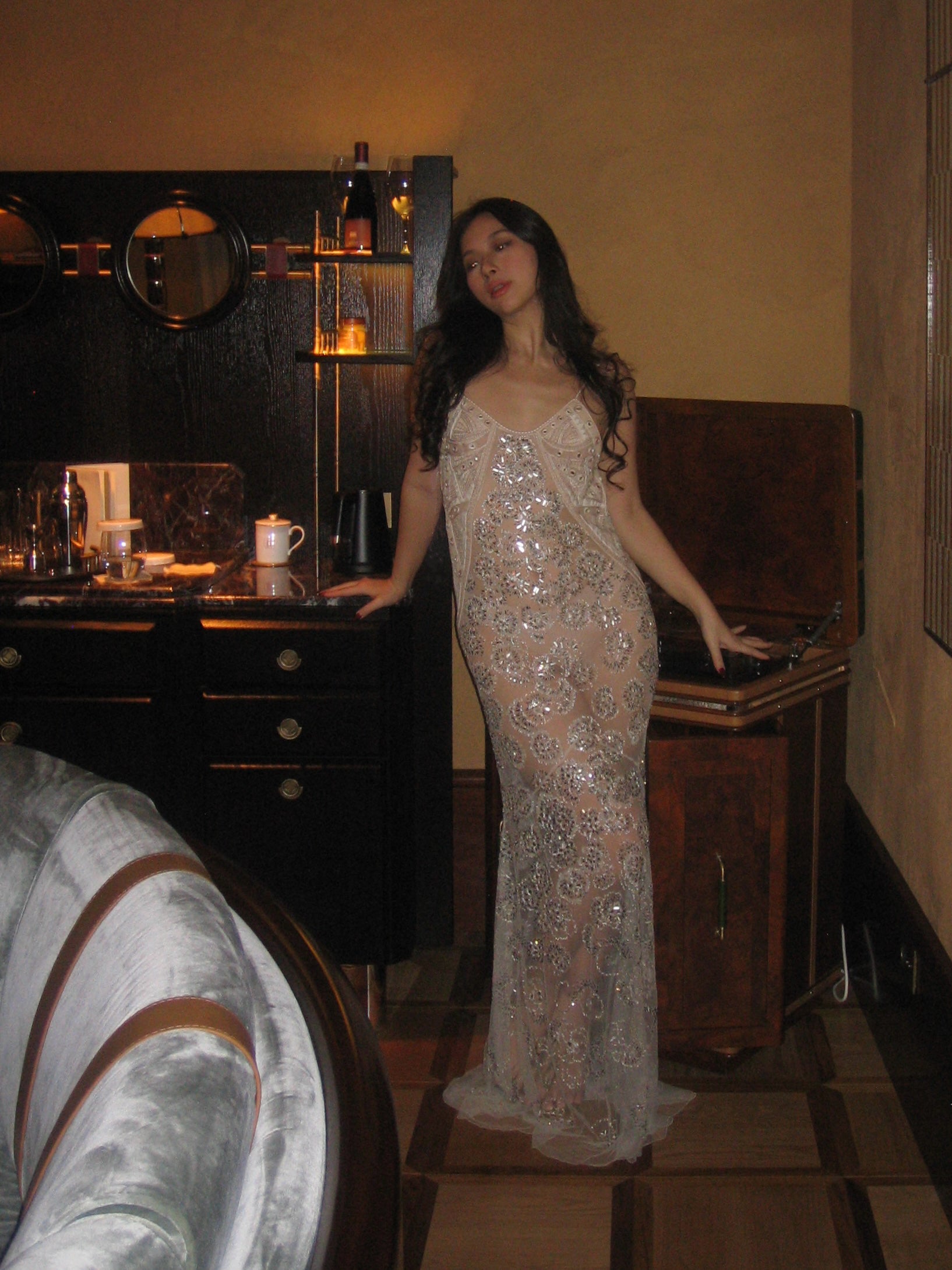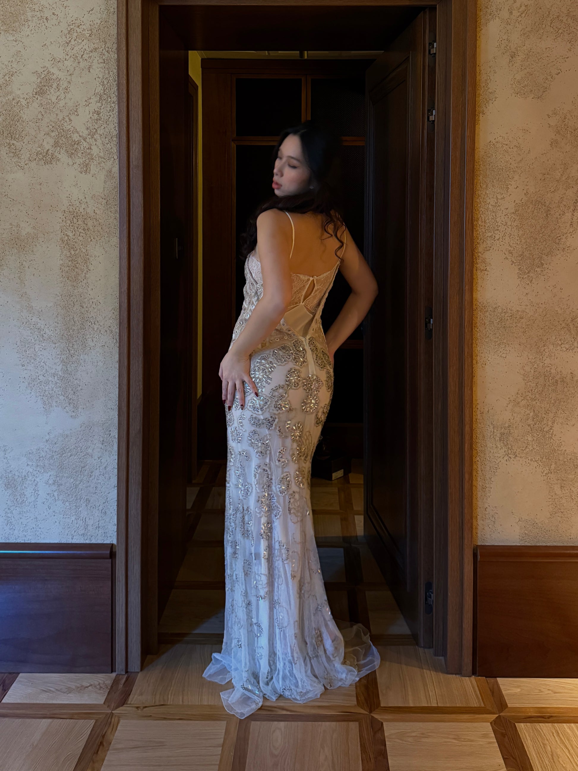 What could be more festive than a sweeping, fully beaded Roberto Cavalli maxi gown? This masterpiece is adorned in shimmering beads from head to toe, complete with a graceful train and a uniquely embroidered bust. Its beauty deepens with two exquisite layers: an outer beaded mesh gown and, beneath it, a floor-length silk chiffon lace slip. Wear them together for a rich, layered effect—or slip on the beaded mesh alone for undeniable, dramatic glamour.